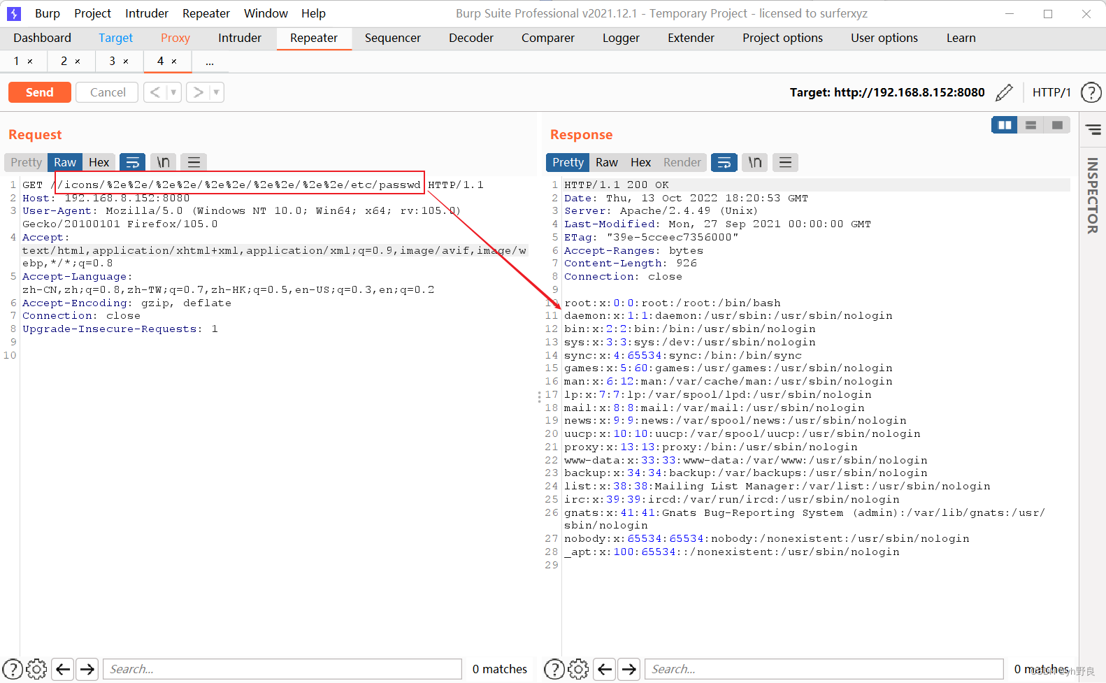的路径穿越符,当检测到路径中存在%字符时,如果紧跟的2个字符是十六进制字符,就会进行url解码,将其转换成标准字符,如%2e->.,转换完成后会判断是否存在…如果路径中存在%2e./形式,就会检测到,但是出现.%2e/这种形式时,就不会检测到,原因是在遍历到第一个.字符时,此时检测到后面的两个字符是%2而不是./,就不会把它当作路径穿越符处理,因此可以使用.%2e/或者%2e%2e绕过对路径穿越符的检测实现目录遍历。复制路径进行访问,成功查看到phpinfo的信息,说明上传的文件被执行。