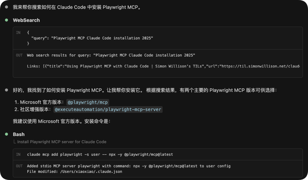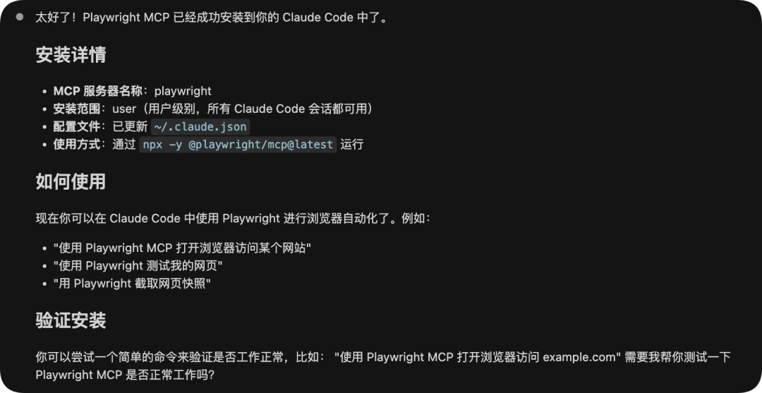 也可以直接在Claude code命令行输入“帮我在 Claude Code 环境中配置并安装 Playwright MCP”,Claude code会自动搜索安装。