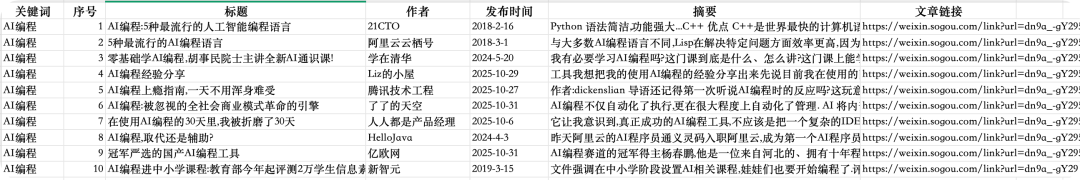 - 表头为:关键词、序号、标题、作者、发布时间、摘要、文章链接;