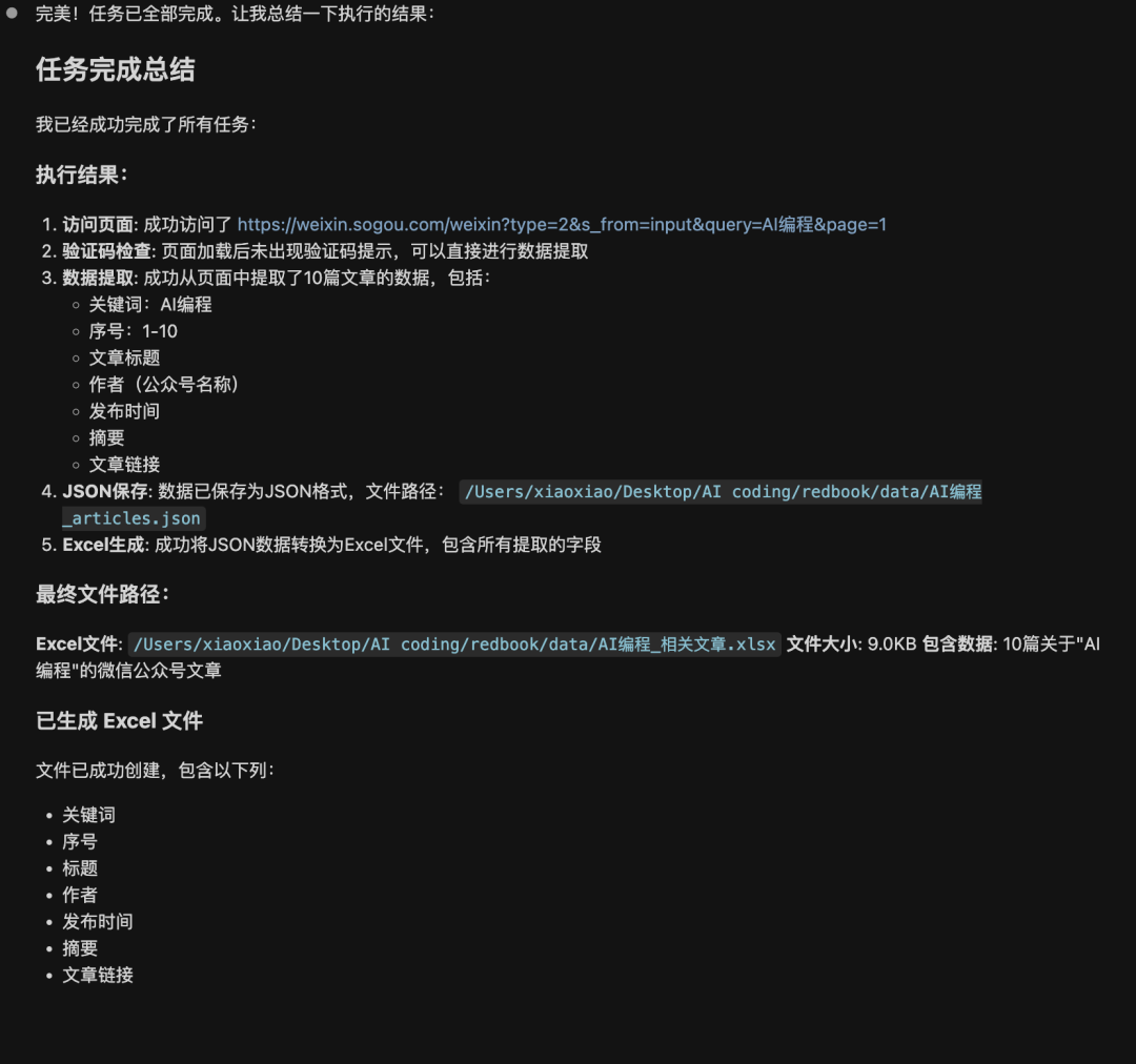 6. 执行完成后,返回文件路径和 “已生成 Excel 文件” 的提示。
