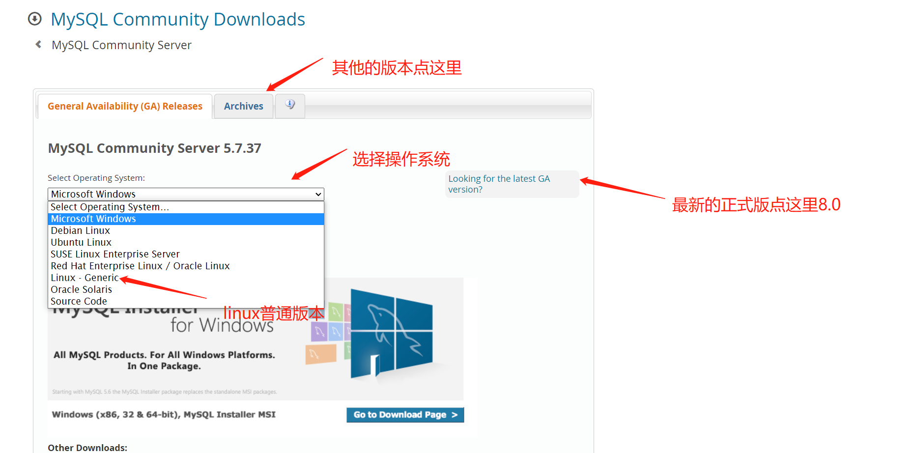 Linux下安装MySQL获取安装包1.从官网下载2.使用wget命令获取环境配置1.检测系统是否自带MySQL安装1.解压重命名2.创建MySQL用户和用户组3.安装数据库启动MySQL并测试1.配置MySQL环境变量2.启动MySQL开放防火墙端口3306获取安装包1.从官网下载官网访问地址:MySQL官网2.使用wget命令获取wget http://repo.mysql.com/mysql-5.7.37-linux-glibc2.12-x86_64.tar.gz环境配置1.检测系