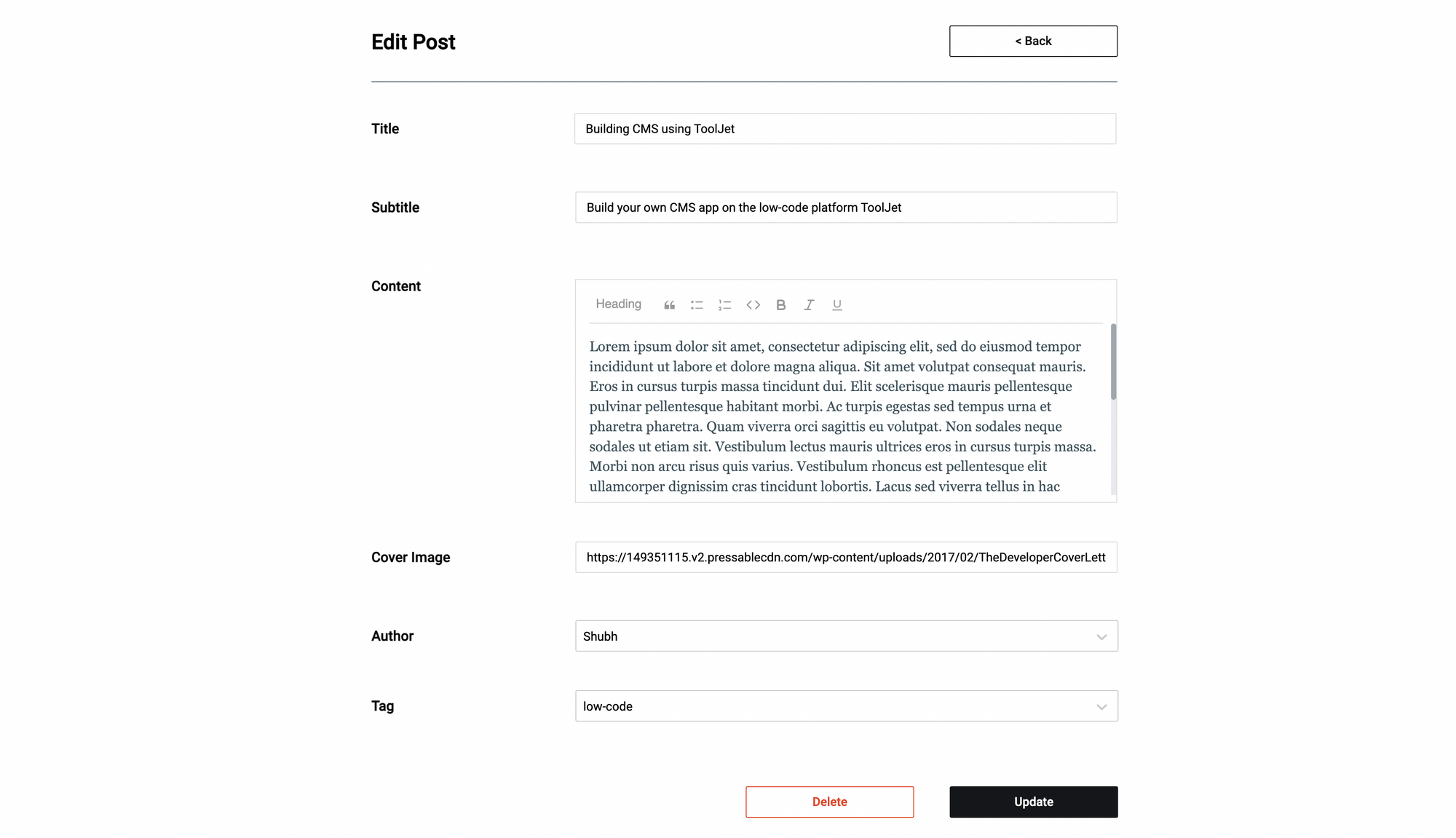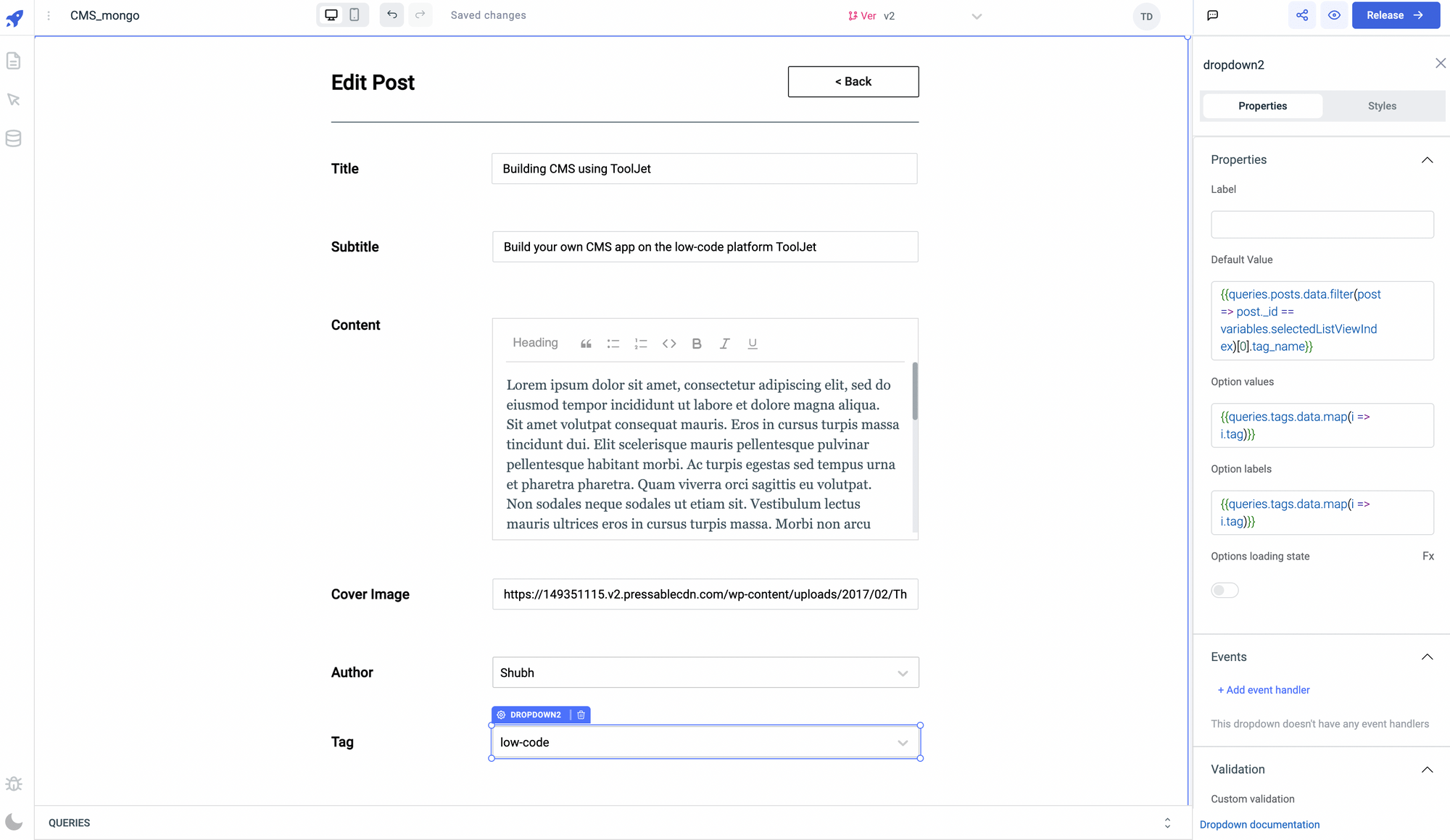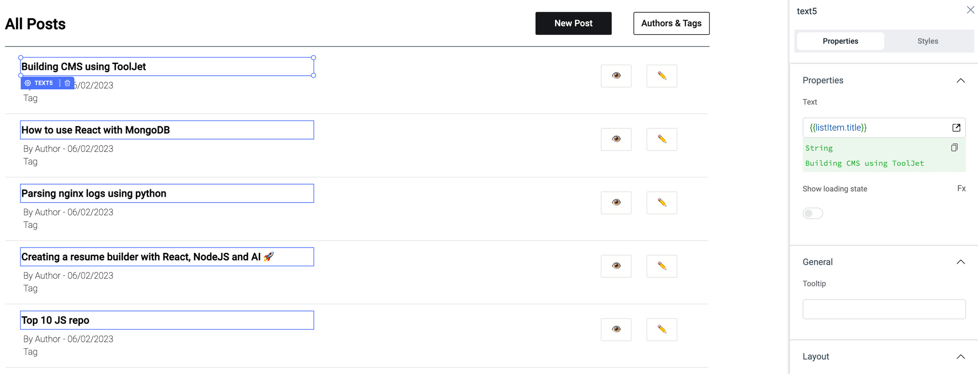 In this tutorial, We will build CMS(Content Management System) using the ToolJet which is a lowcode application development platform. The CMS can be used to perform CRUD operations to the MongoDB which is used as the database for the NextJS application.
