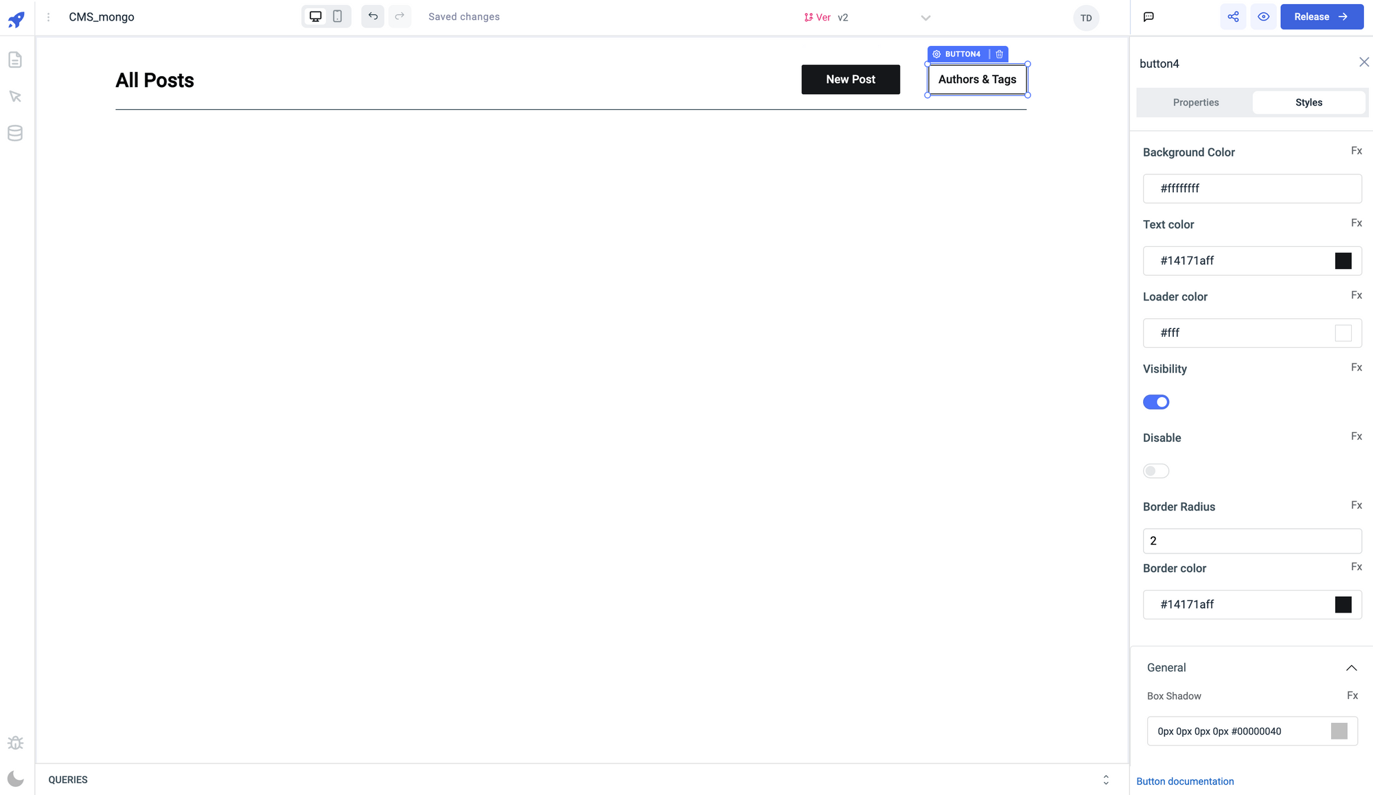 • For the second button, we will set the button text to Authors and Tags and edit its Styles. Set the button color to white/#ffffff , text color to #14171a, loader color to #14171a, border-radius to 2 , border color to #14171a