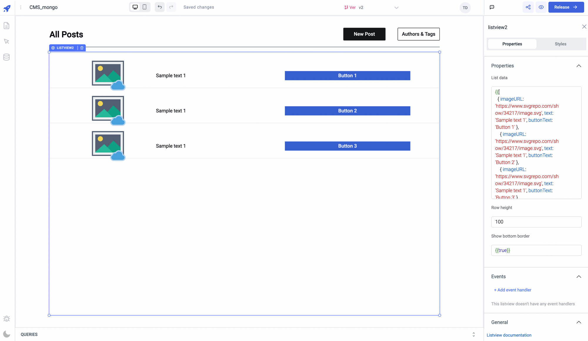 This page will use the listview component to show a list of blogs and buttons to navigate other pages. Let’s build the UI: