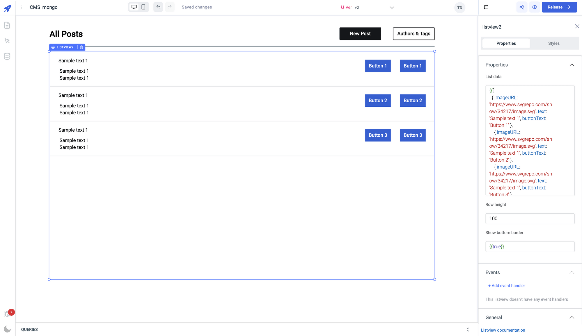 • Currently, the listview looks very rough since we haven’t styled the nested components (text and buttons) yet. To make it look better, we can add some styling to the components and some placeholder text until we create the query for the data to be loaded into the listview.