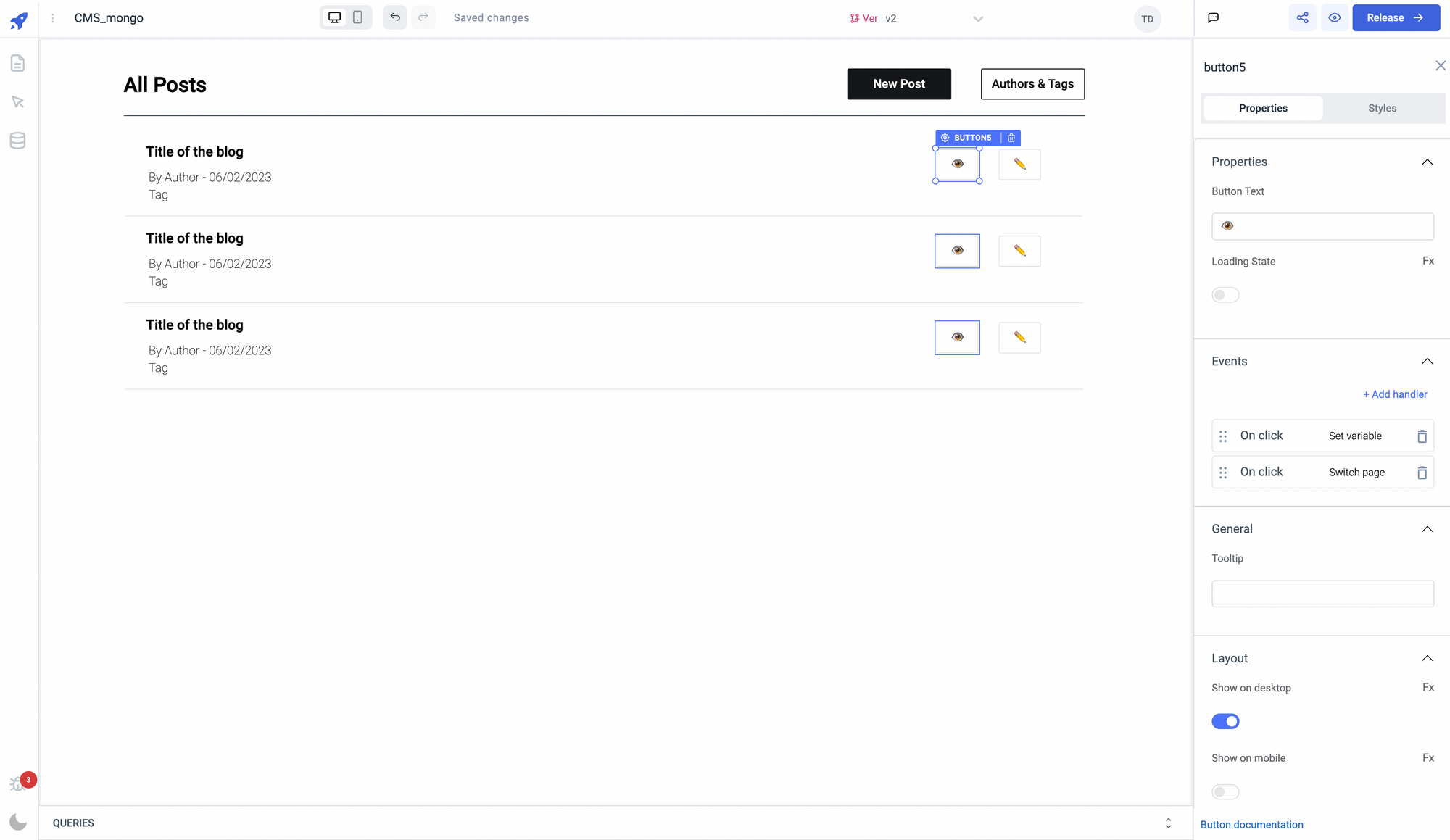 • Add an Event Handler to the Authors & Tags button, choose switch page action, and select the authors_tags from the dropdown. Now, whenever the button is clicked `Authors & Tags` page of the application will be loaded.