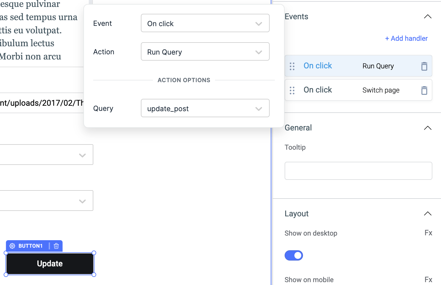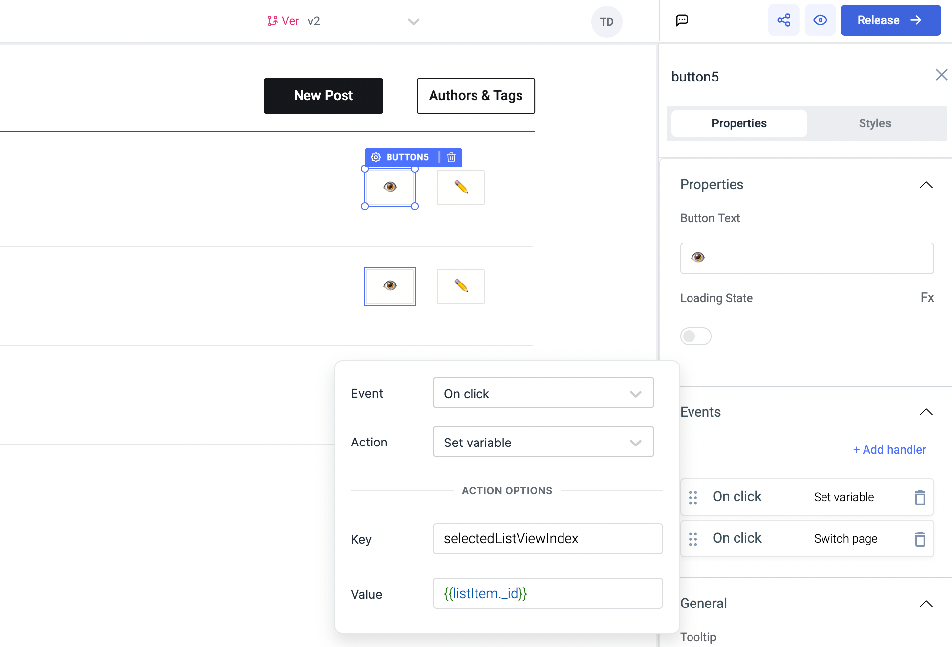 • For the view/👁️ and edit/✏️ buttons inside listview, we need to add event handlers. On both buttons, we need to add an event handler for set variable  event that creates a variable selectedListViewIndex and the variable value will be {{listItem._id}} – this value will be there once we create the query. Another event handler that we need to add is to switch the page, for the edit button link edit_post page and for the view button link view_post page.