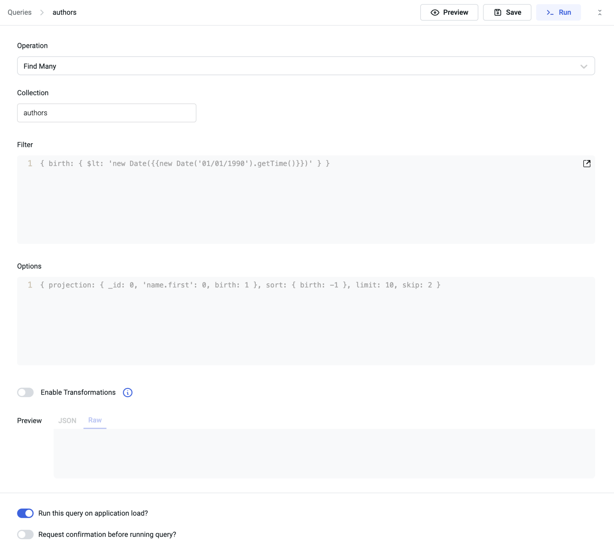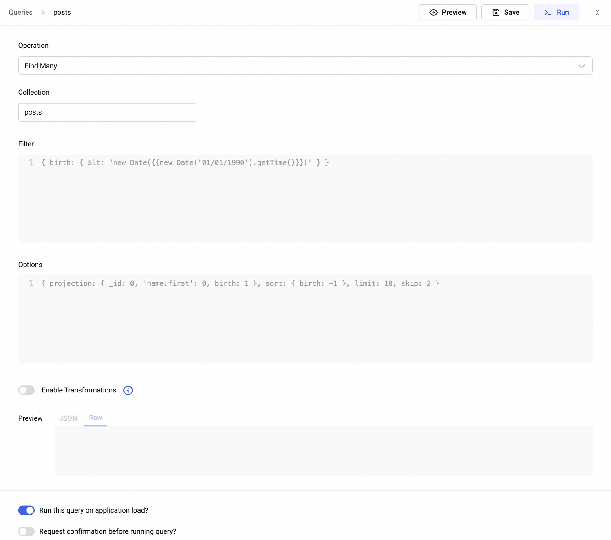 • From the Advanced section, toggle on the Run query on application load? option, and then save the query. This will execute the query every time the app is loaded.