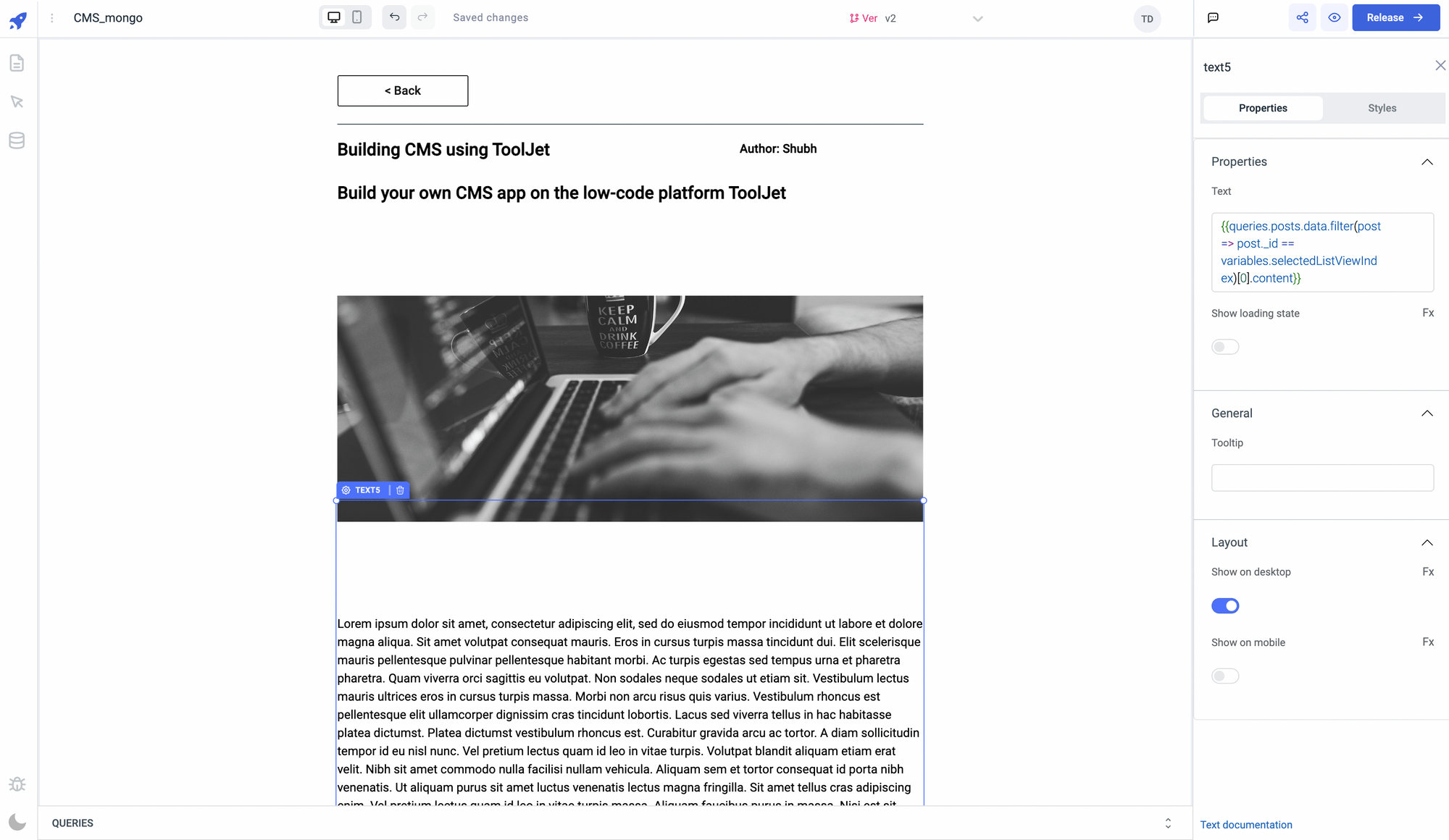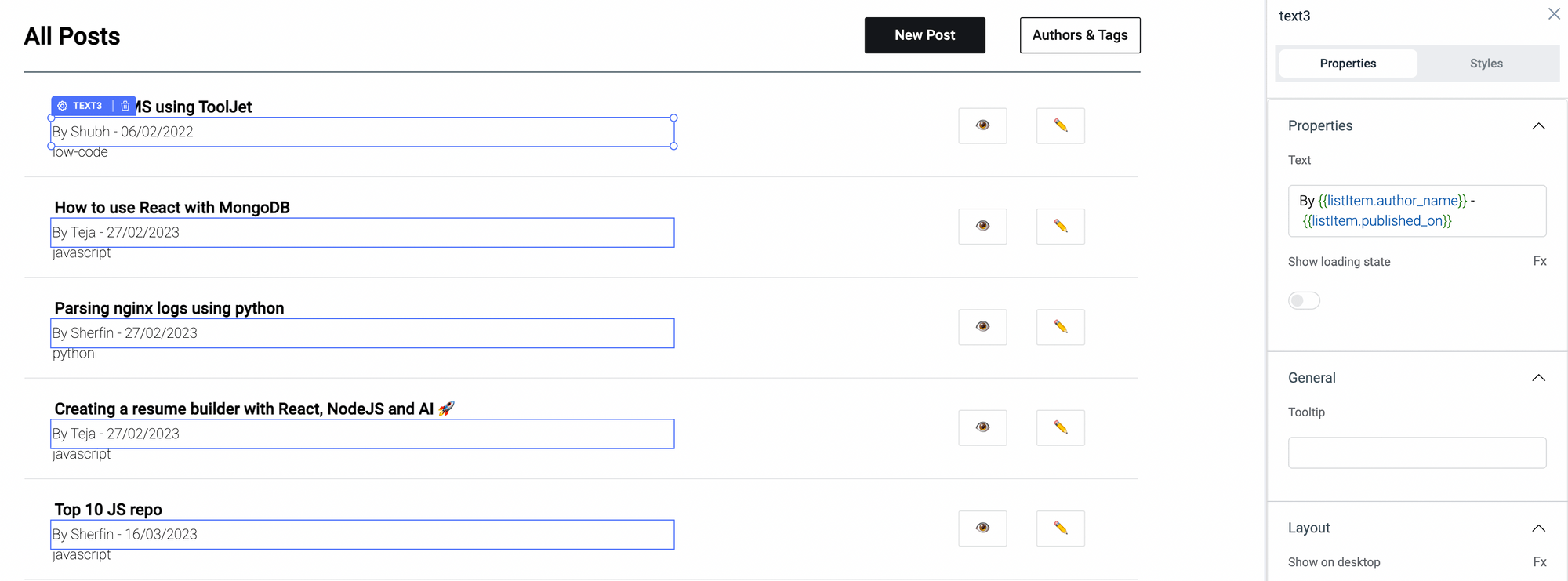–   text component for showing the Author: text = Author: {{queries.posts.data.filter(post => post._id == variables.selectedListViewIndex)[0].author_name}} , font weight = bold, font size = 14