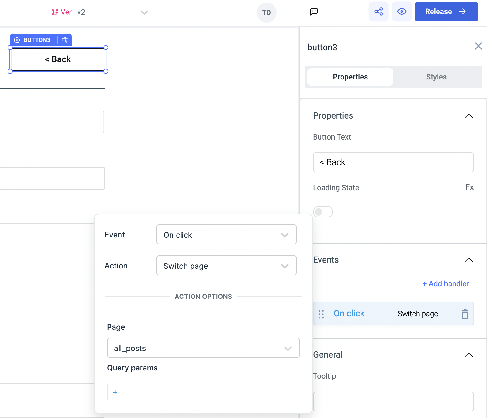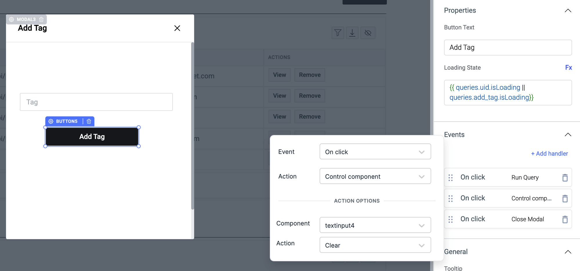 – A button component for triggering the queries that we will create in the next section, set the button text to Add Tag