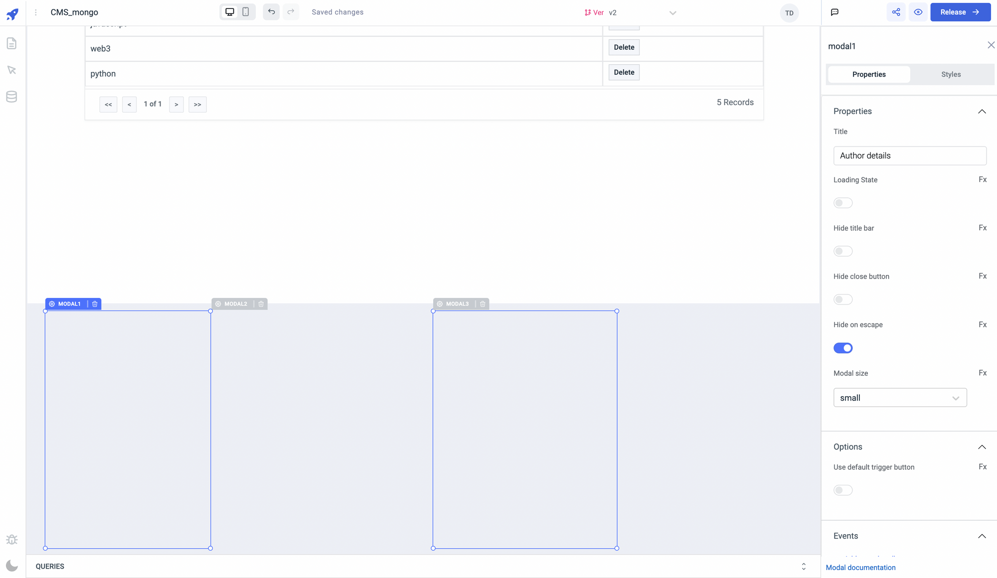• Drag three modals somewhere below the container. These modals will be shown when the following buttons are clicked: +Add button for Authors, +Add buttonfor tags, and View action button on Authors table.