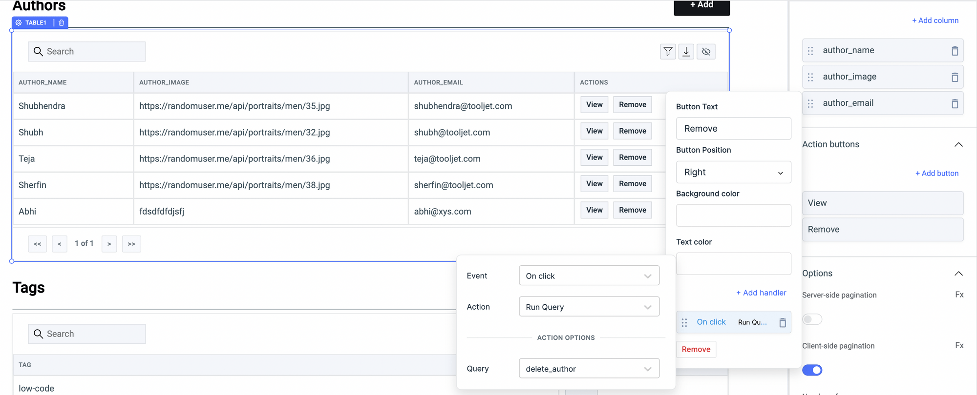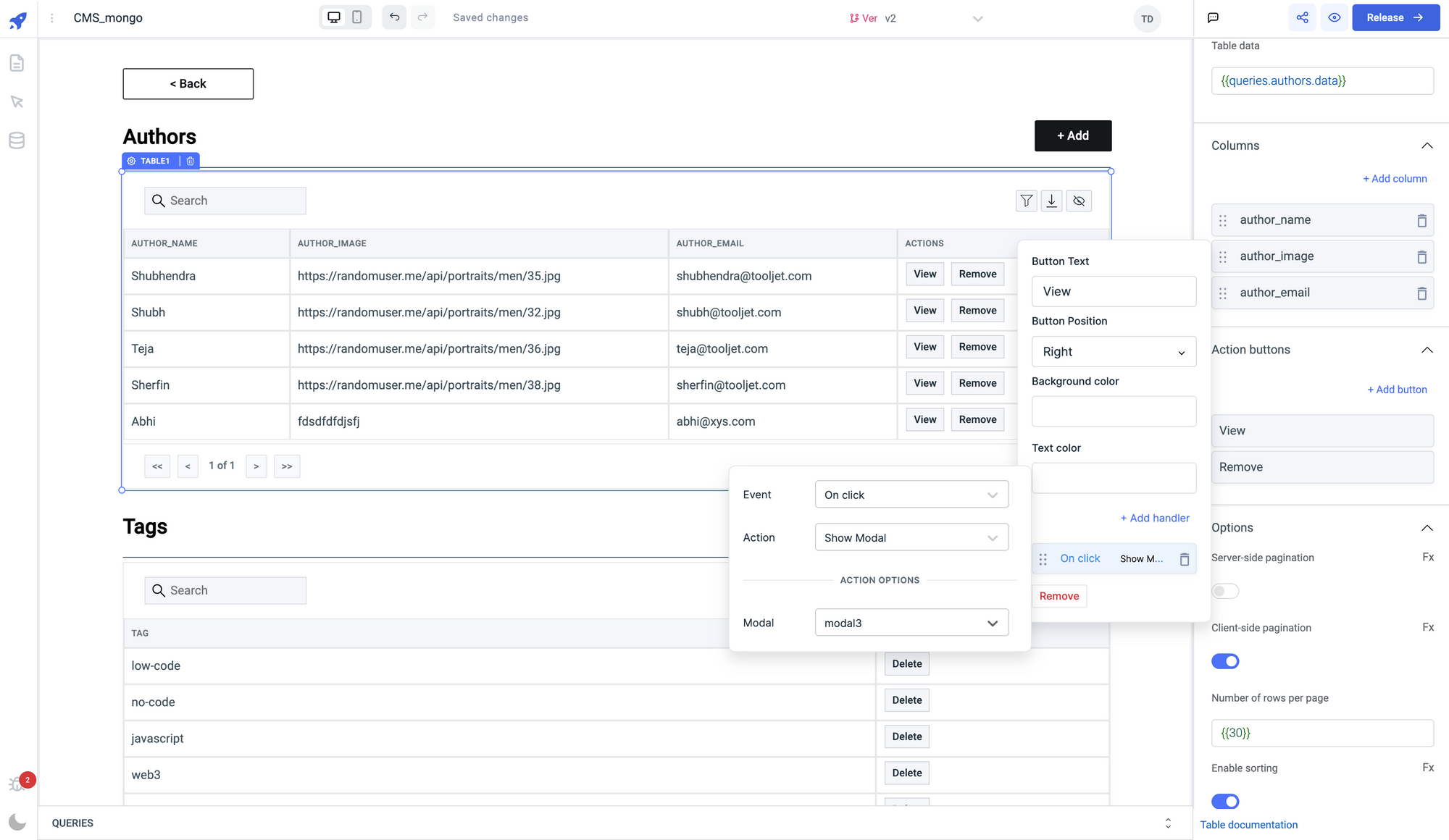 • Go to the Authors Table, add two Action buttons:  View and Remove. On View action button, we will add an event handler to show the modal3 and the Remove action button will trigger the query that will remove the selected author from the collection.