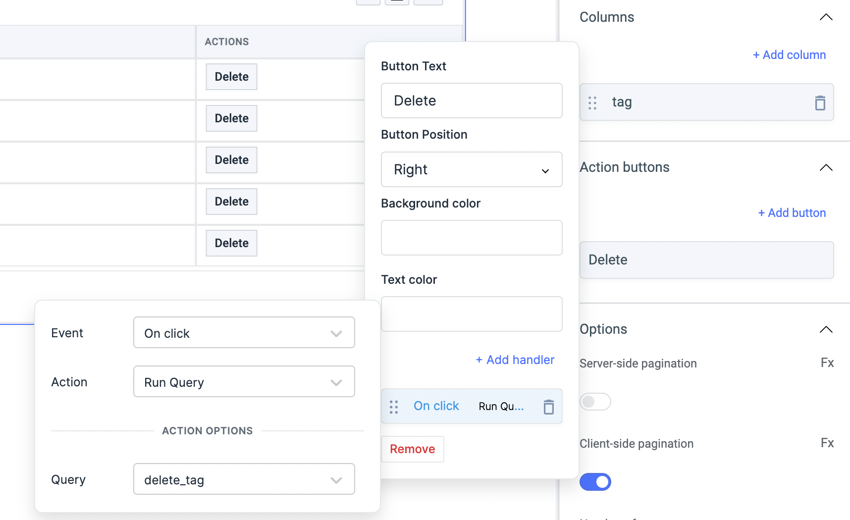 • Edit delete action button and add the event handler to run the delete_tag query.