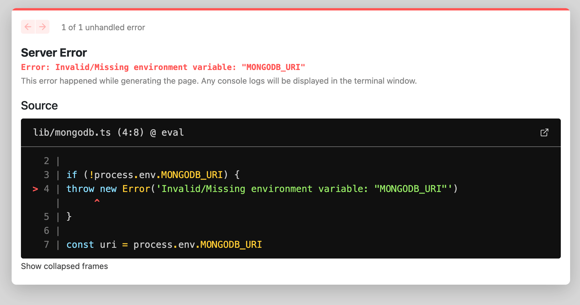 We will get an error similar to the one in the screenshot above because the app is built but we haven’t connected our MongoDB database yet to the application. So let’s do that.