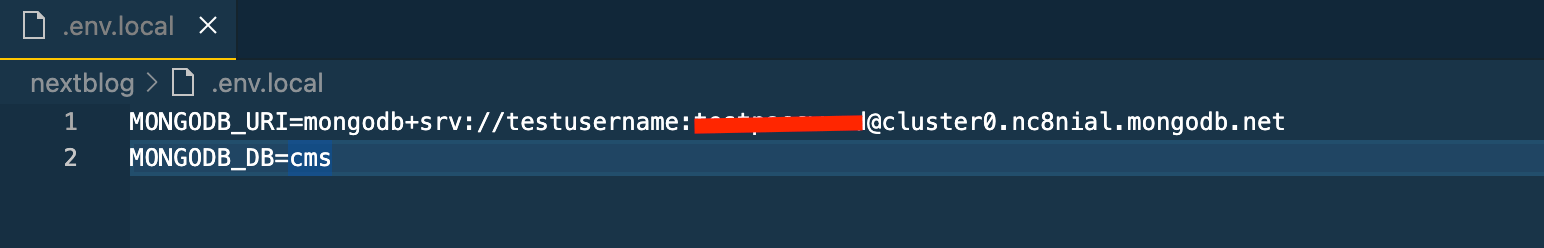 • In this file, we will need to enter the value for MONGODB_URI and MONGODB_DB variable. MONGODB_URI is nothing but the connection string till / and MONGODB_DB will be the name of the database. Go to the beginning of the tutorial to learn how we can obtain the connection string from the Atlas. The env.local file will look like this: