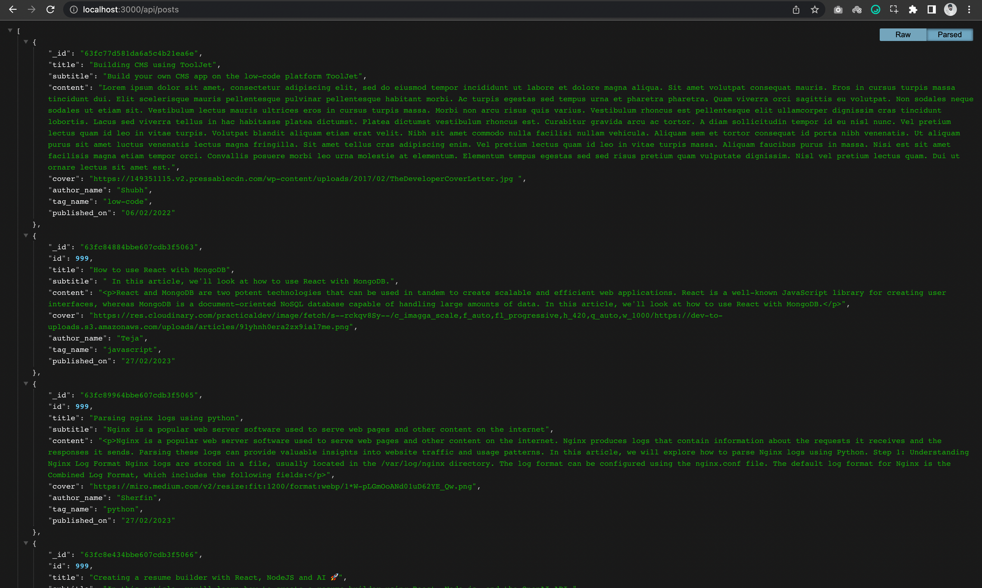 Now, if we navigate to localhost:3000/api/posts, we’ll see a result that looks like this: