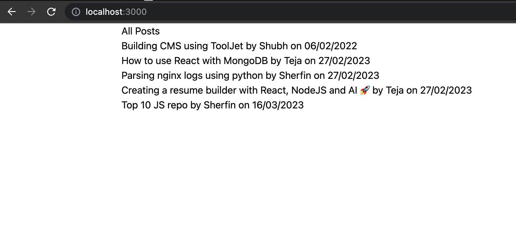 Tada 🎉 Now you can see the posts collection data on the homepage of the application. This is just the rough presentation of the data on the frontend – you can make further changes to improve the UI.
