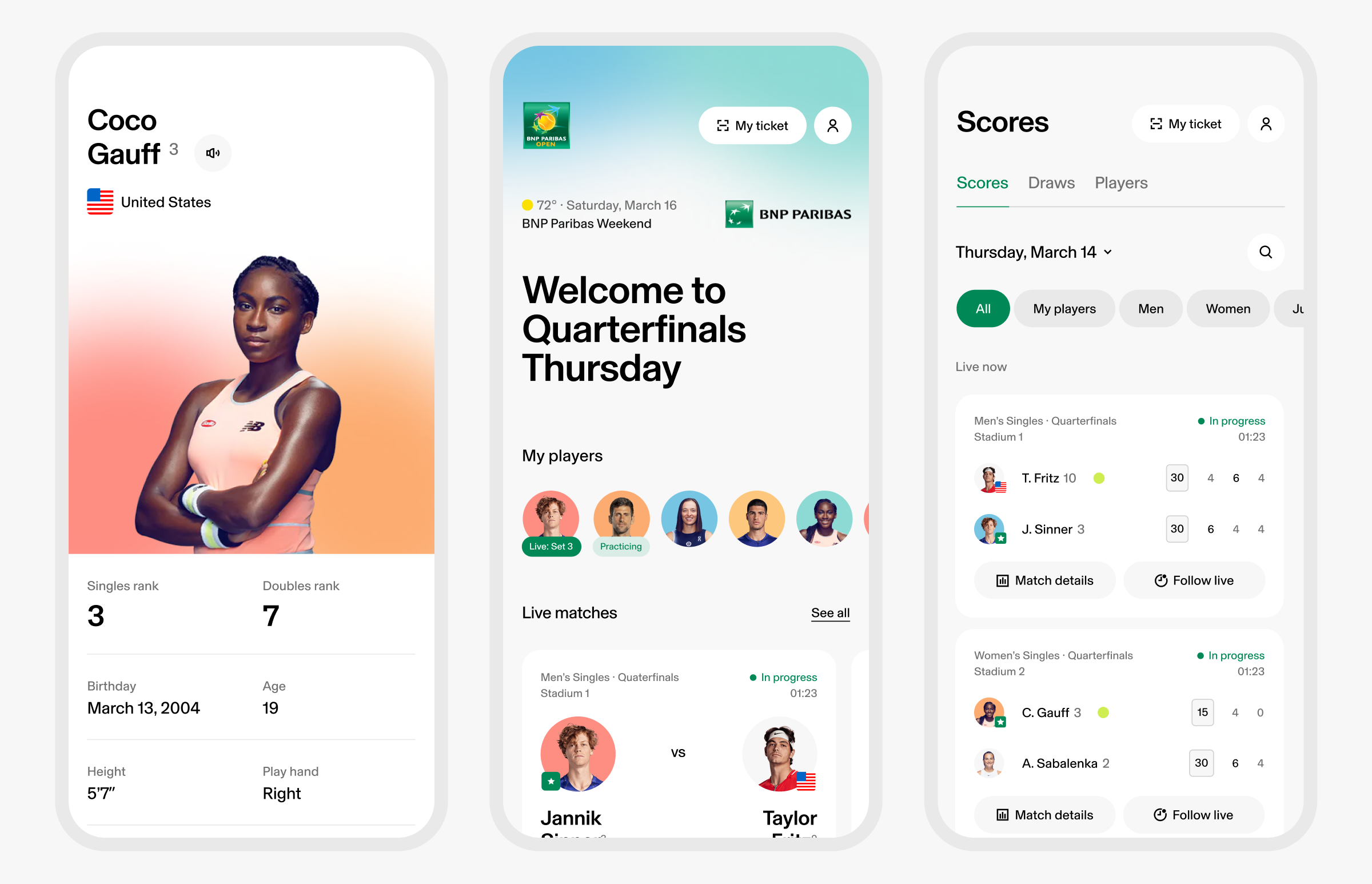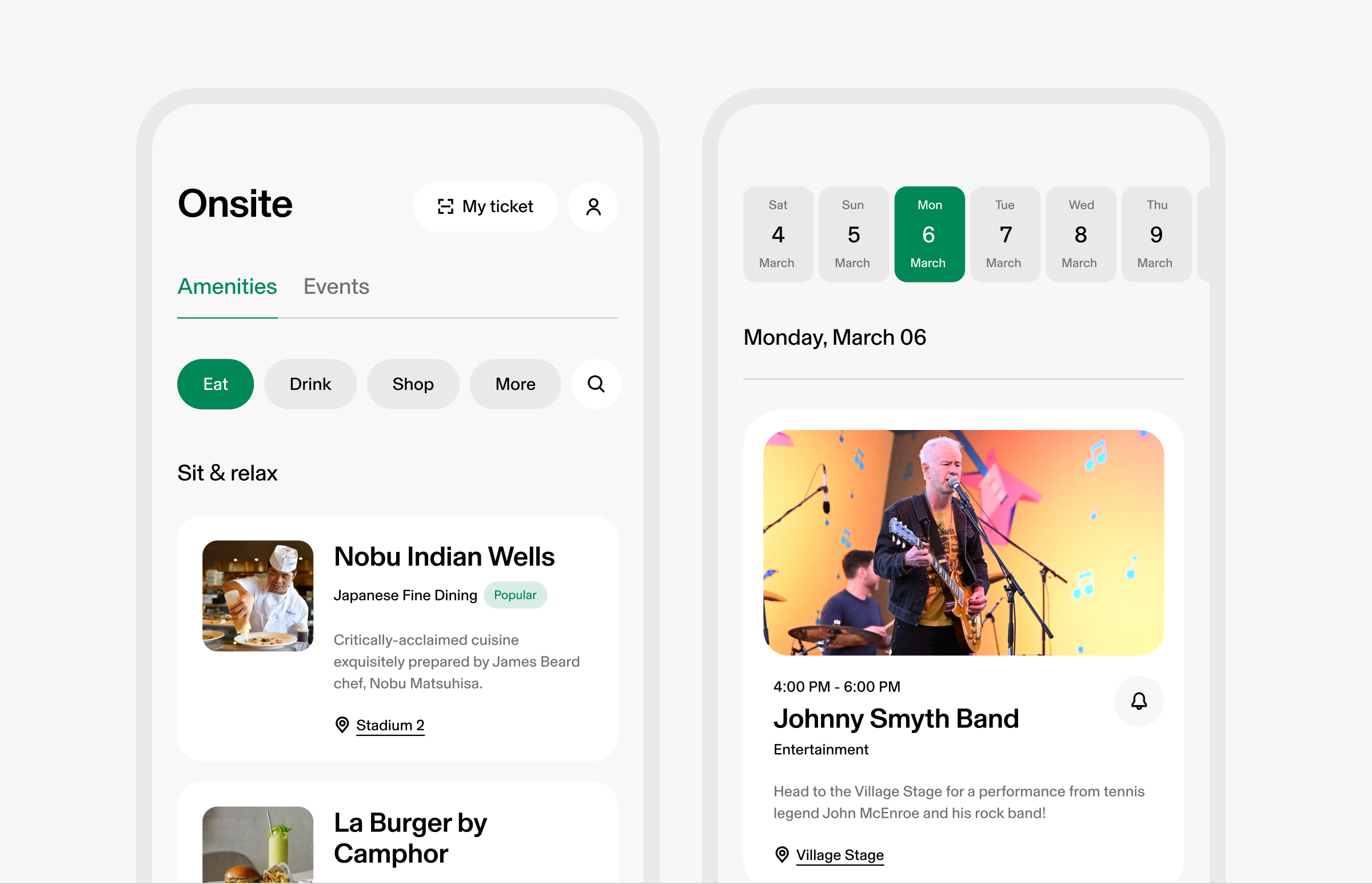 The mobile app is the go-to companion for anyone on-site at the Indian Wells Tennis Garden, with dining information and menus for the more than 20 food and beverage options; real-time notifications for activities happening around the grounds, as well as daily practice schedules.