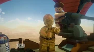 C-3PO appears in The LEGO Movie along with Han Solo , Chewbacca , and Lando Calrissian aboard the Millennium Falcon . He also appears in the background after every Master Builder is captured.