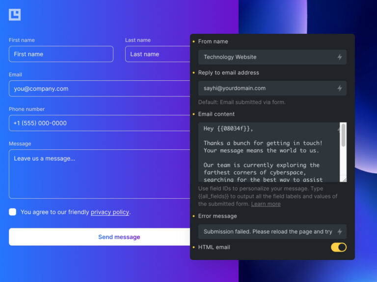 Send personalized emails on form submission. Utilize dynamic fields for specific or all form data and automatically dispatch custom confirmation emails for improved user interaction.
