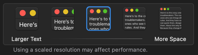 My ideal setting, of course, is the middle option… which results in the warning above. “Using a scaled resolution may affect performance.”