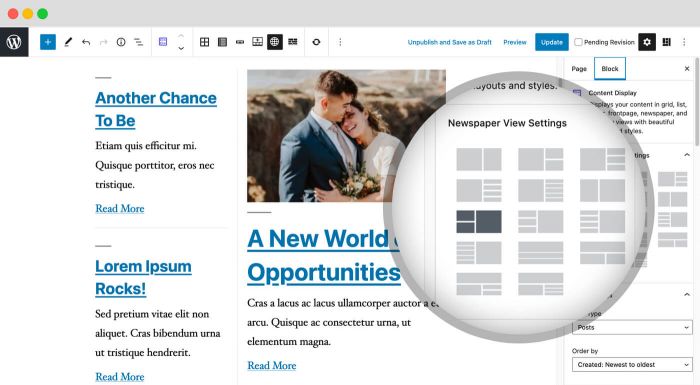 - Bloque de visualización de contenido: PublishPress Blocks tiene un bloque para mostrar tus últimas publicaciones. Varias vistas están disponibles, incluyendo cuadrícula, lista, carrusel, portada, periódico y mosaico. Algunas vistas tienen sus propios diseños y ajustes