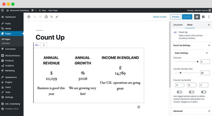 Bloques de recuento: El bloque de recuento es perfecto para mostrar números en Gutenberg. Puedes utilizarlo para mostrar cuántos clientes tienes, cuánto dinero has recaudado, etc.