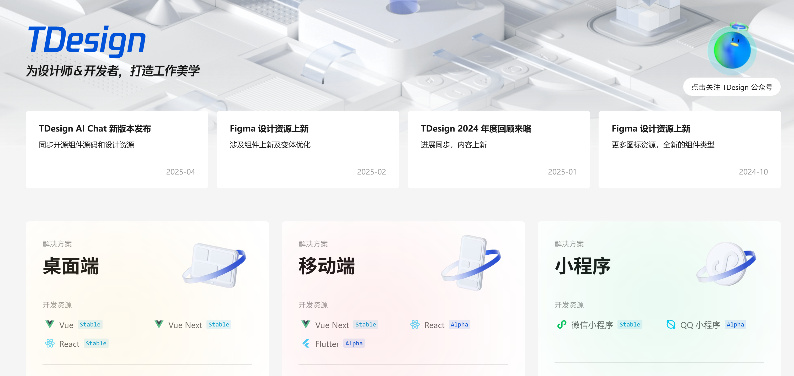 接下来,我们将使用 TDesign 来构建更美观的前端页面。 那么,TDesign 是什么呢?它是由腾讯推出的一套企业级设计体系,并且完全开源。TDesign 提供了完整的解决方案,涵盖视觉规范、设计工具以及前端组件库,旨在帮助开发者和设计师高效打造高质量、风格统一的产品界面。 在小程序方面,TDesign 专门为 微信小程序(WeChat Mini Program) 和 QQ 小程序 提供了组件库,其设计风格和交互体验与 Web 端组件保持一致。