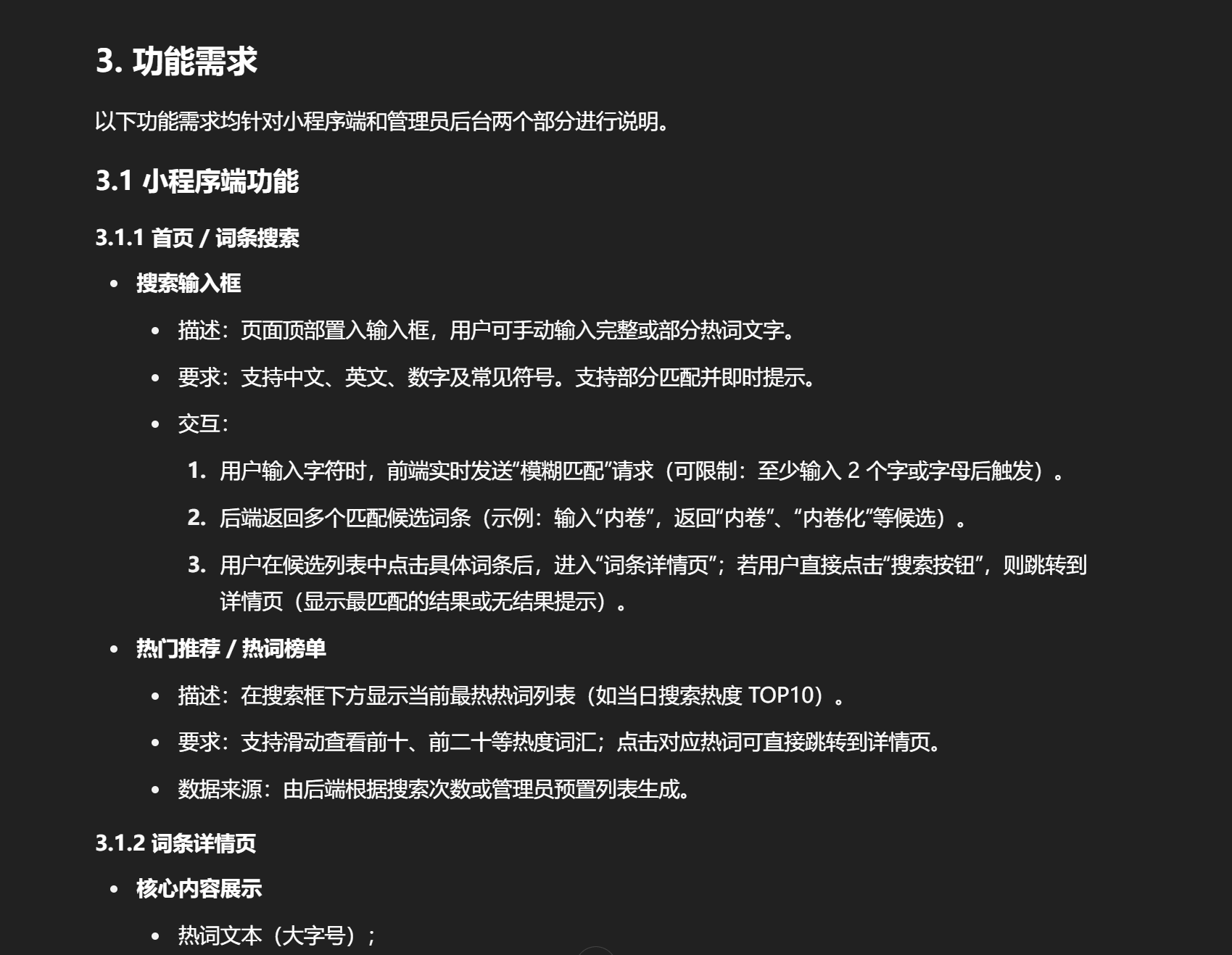 在此基础上,我们将借助大模型,生成一份完整的功能需求文档。