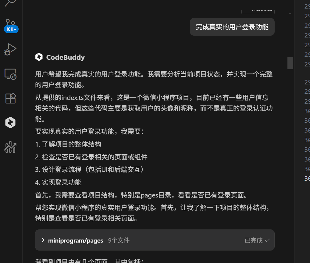 这次我们以 CodeBuddy 助手 为例,来演示小程序开发,并搭配 CloudBase AI ToolKit 一起使用。CodeBuddy 助手是一款 AI 编程助手,可以从头到尾支持完整的软件开发流程。而 CloudBase AI ToolKit 则是腾讯云开发 CloudBase 新推出的 AI 开发工具套件,专门为 AI 场景打造。