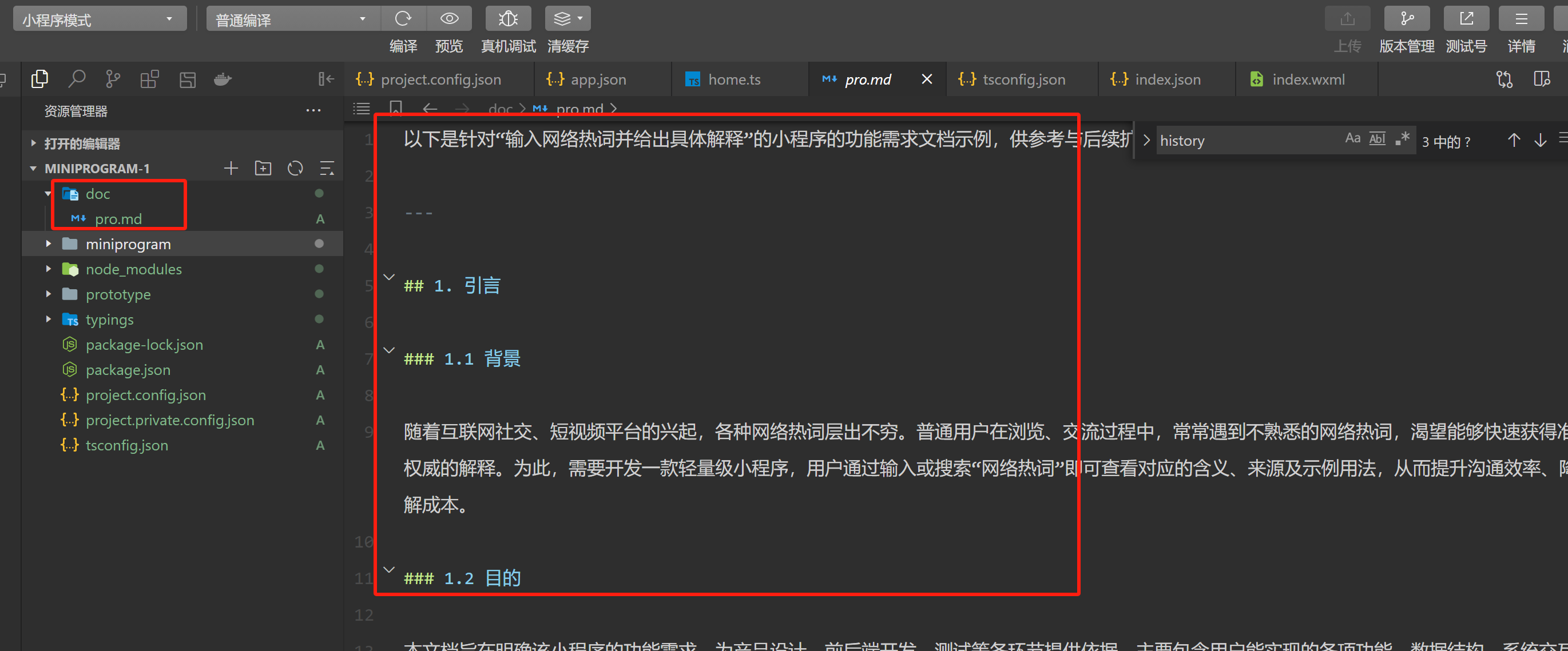 我们将大模型生成的功能文档保存到项目目录下的 doc/pro.md 文件中。