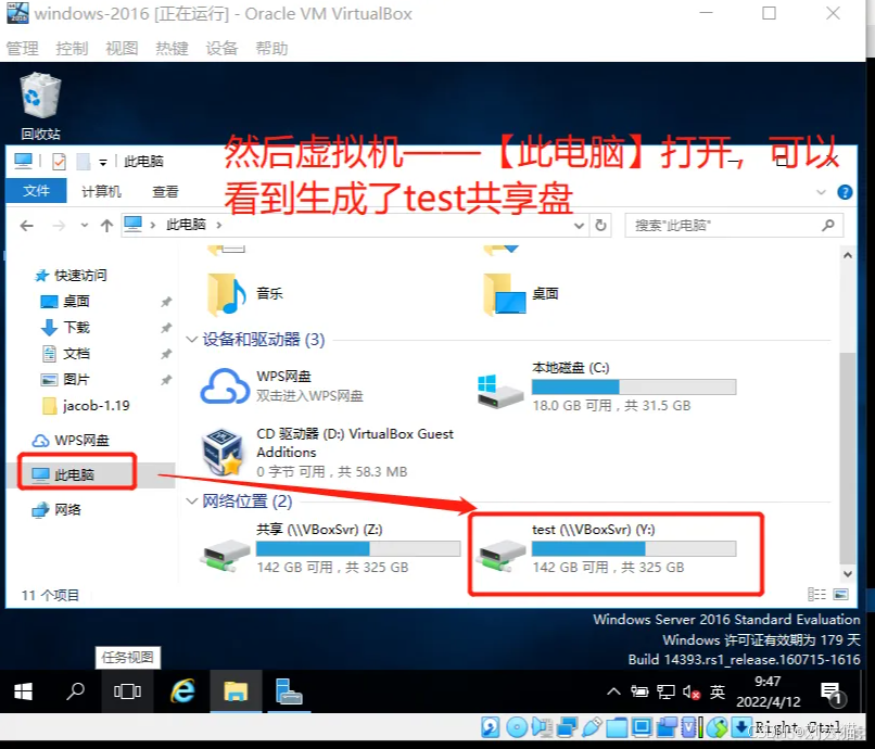 最后可以看到虚拟机中生成了test共享盘,此时我们可以宿主机或者虚拟机拖放文件到此共享盘下,然后虚拟机、宿主机均可访问,实现文件共享