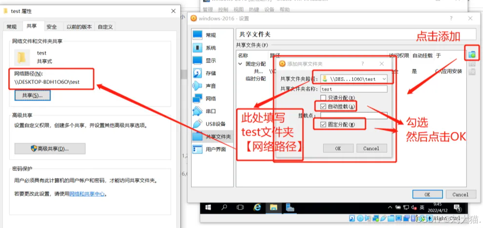 如下图,将宿主机共享文件夹test的网络路径,填写到虚拟机共享文件夹的【共享文件夹路径】处,添加共享文件夹: