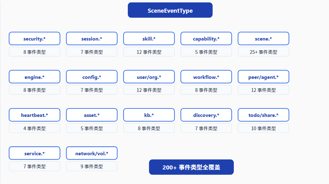 SceneEngine 构建了基于 Spring ApplicationEvent 的完整事件体系,定义了 200+ 种事件类型,覆盖安全、会话、技能、能力、配置、引擎、场景、用户、组织、工作流、节点、心跳、资产、知识库等 16 个领域。