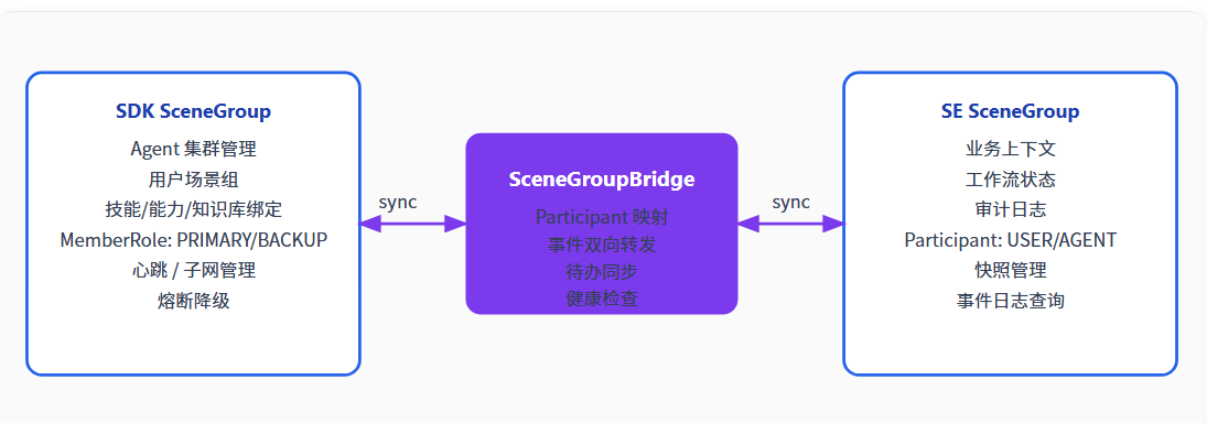 SceneGroupBridge 是 SDK SceneGroup 与 SE SceneGroup 之间的双向映射和同步桥梁,解决了两个系统间的模型差异: