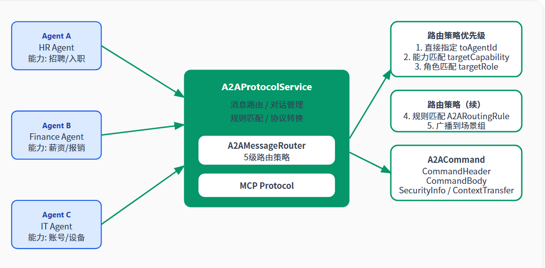 SceneGroupAuditEvent)A2A(Agent-to-Agent)协议是 SceneEngine 3.0.3 的核心创新之一,它定义了 Agent 间通信的统一标准,支持消息发送、请求-响应、多 Agent 对话、智能路由和协议转换。