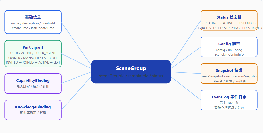 一切业务皆场景,SceneGroup 是协作的基本单元,所有资源围绕场景组织