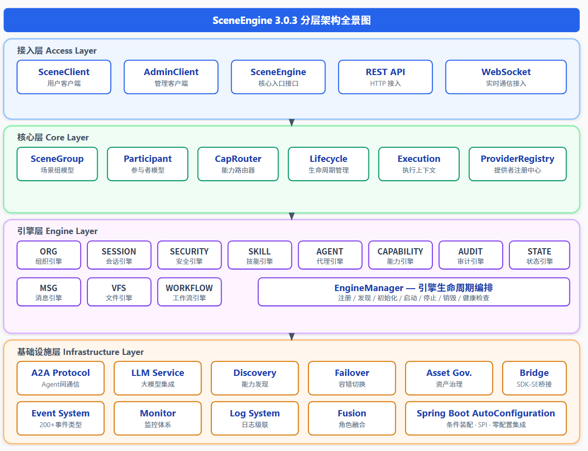 SceneEngine 3.0.3 是一个设计精良、职责清晰的场景驱动协作引擎。它以 SceneGroup 为核心抽象,以 A2A 协议实现 Agent 间智能通信,以 CapRouter 实现能力精准分发,以 200+ 事件类型构建全域驱动体系,以 11 大引擎覆盖完整功能域。