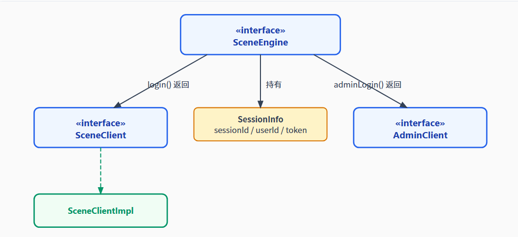}«interface»SceneEngine«interface»SceneClient«interface»AdminClientSceneClientImplSessionInfosessionId / userId / tokenlogin() 返回adminLogin() 返回持有