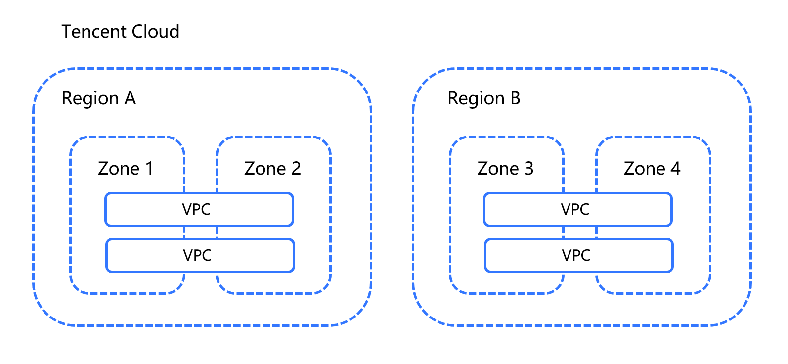 一个地域由一个或多个可用区组成。同一地域内的不同可用区之间 VPC 内网互通。不同地域之间的可用区完全独立。