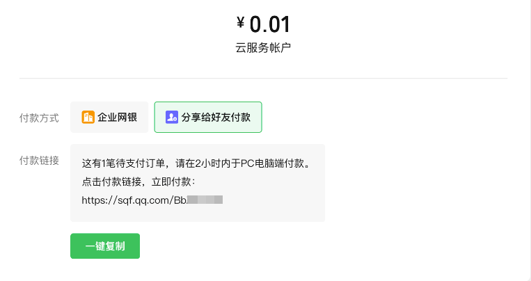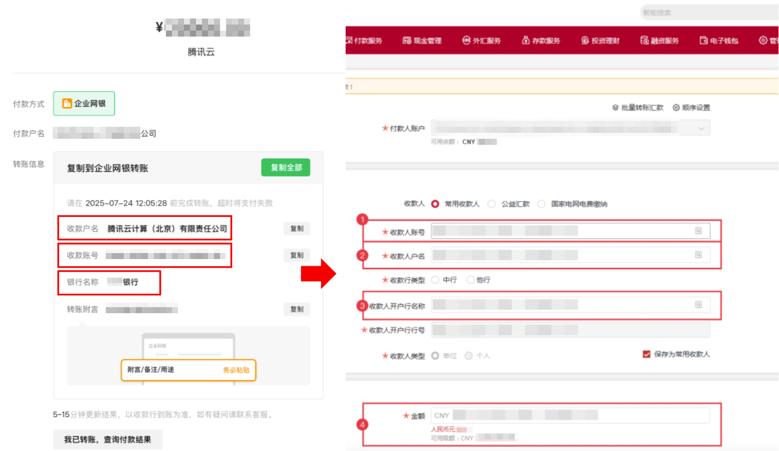 5. 请用户打开企业网银后台,在转账/汇款单内粘贴腾讯云账户对应收款信息,完成对公打款。