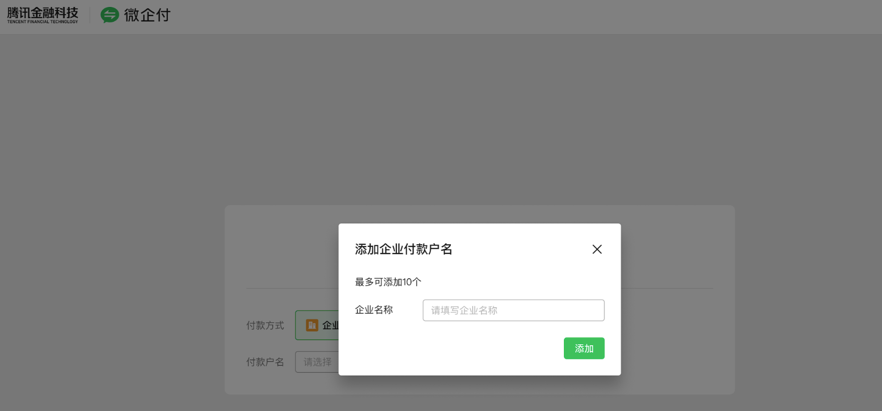 使用微信扫码验证成功后,需添加对公付款账户户名(仅首次使用需要添加,已添加户名后续会默认展示,支持添加多个)。
