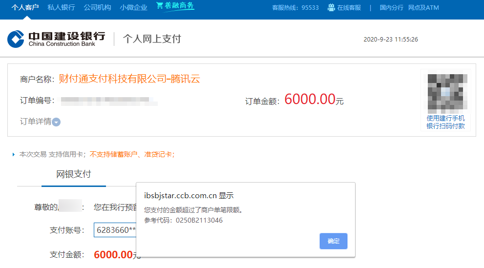 网银支付:腾讯云没有设置限额,取决于客户针对银行卡本身设置的支付限额。同时不同银行支付限额不同,如遇到以上截图问题,建议咨询银行。