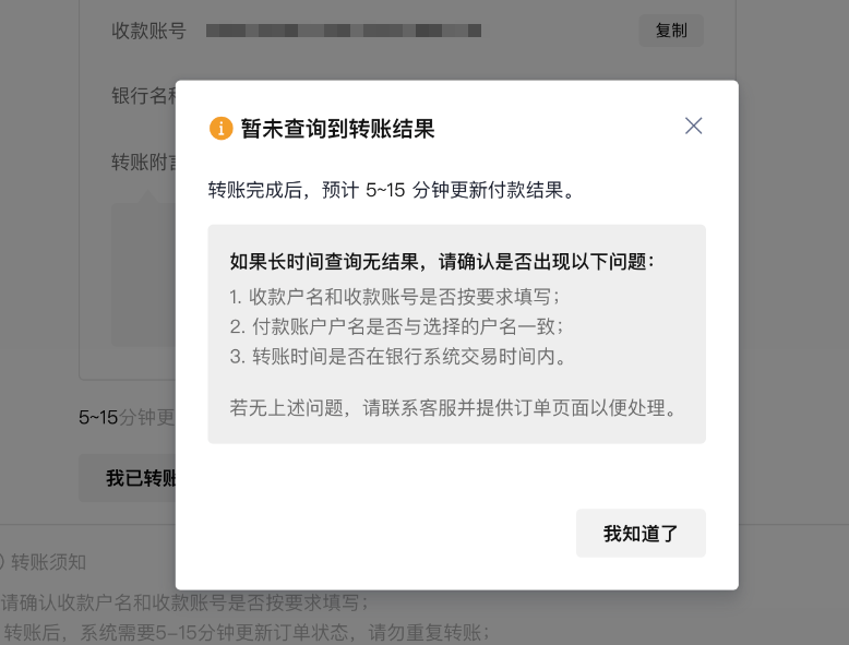 如果未完成转账就提前查询结果,或者未按要求转账,将提示如下,请按页面提示检查转账信息或稍后查询。