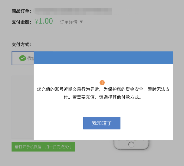 针对短时间内多个支付账号向同一个 UIN 进行在线充值时,可能会出现系统限频拦截。拦截后页面提示如下:
