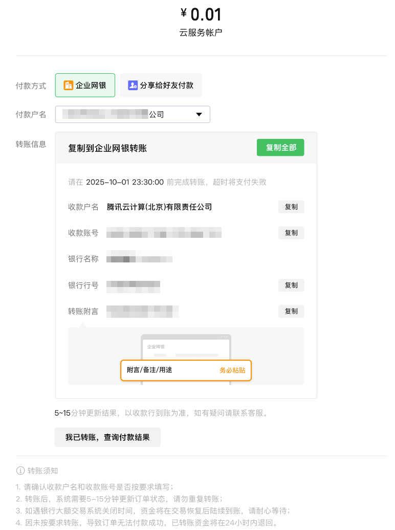 请按照腾讯云专用收款账户信息打款,预计5 - 15分钟可查询到付款结果。