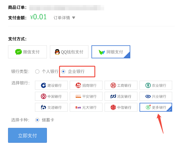 使用企业网银支付时若可选银行列表中无您的付款银行,可选择企业银行的更多银行选项,支持全量银行的对公转账。