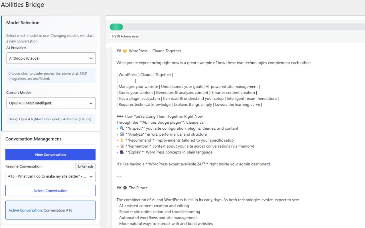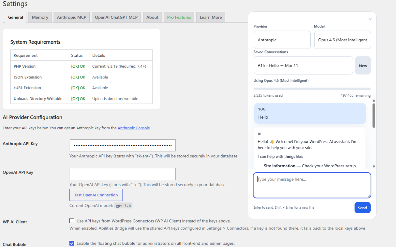 Abilities Bridge connects AI to your WordPress site. Use the built-in admin chat, connect via MCP to Claude Desktop, or integrate with other MCP-compatible applications. Supports both Anthropic (Claude) and OpenAI models.