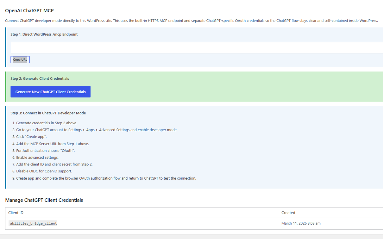 - Go to Abilities Bridge > Settings > OpenAI ChatGPT MCP