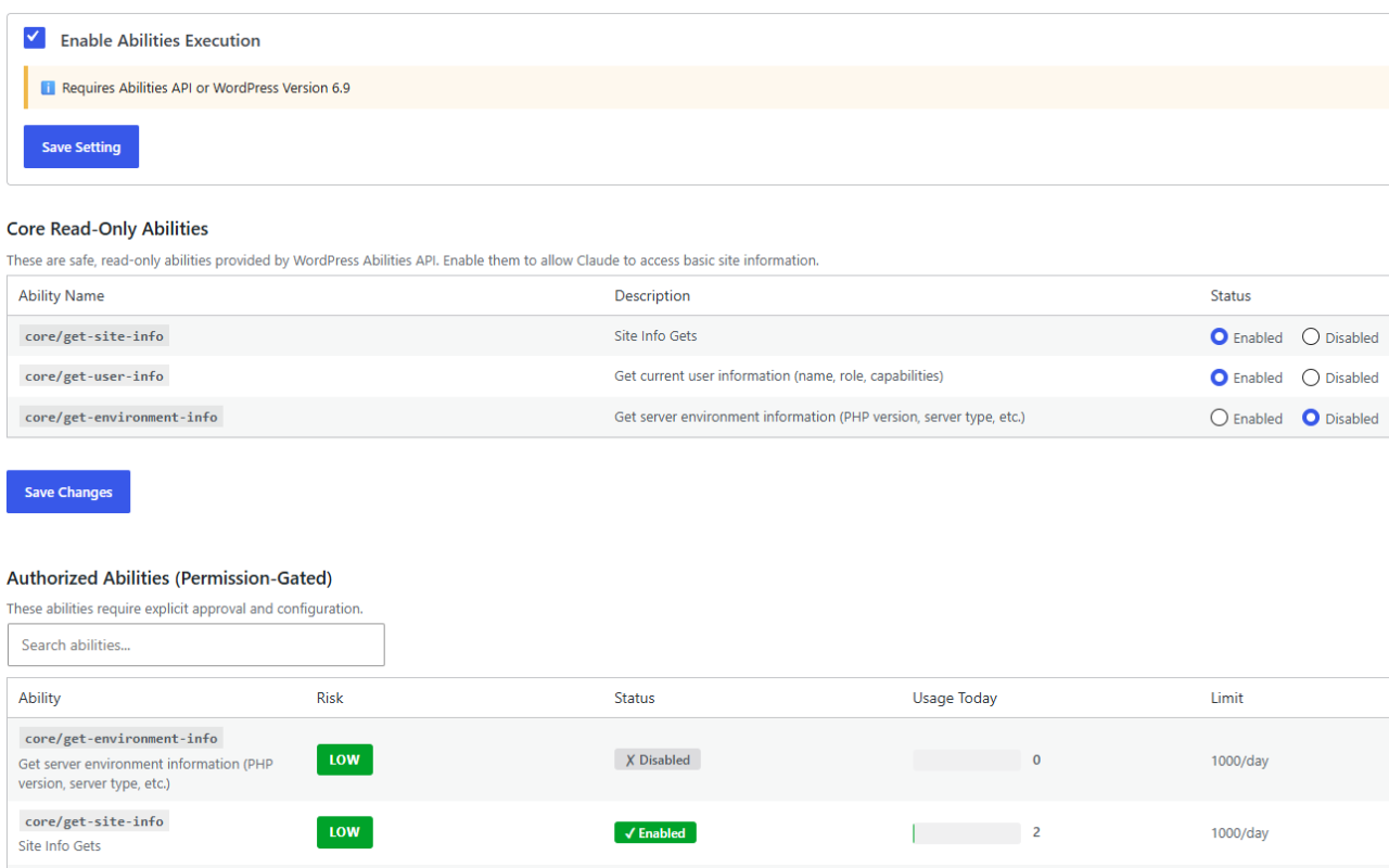 AI-callable WordPress functions (creating posts, managing users, etc.) that must be individually authorized. Each ability is controlled by rate limits, risk levels, and approval requirements.